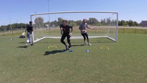 練習の効果 フォワードのファーストタッチで振り向く技術の向上 落としのフェイクからのターン(振り向き)を学べる 練習手順 オフェンスとディフェンスに分かれ、動画のようにゴール正面から左右にずらしてマーカーをセット 二つの…