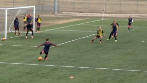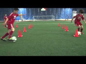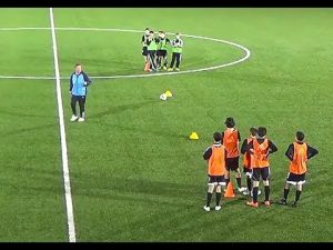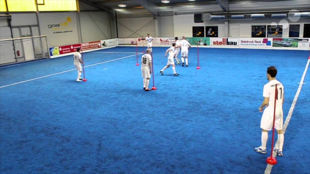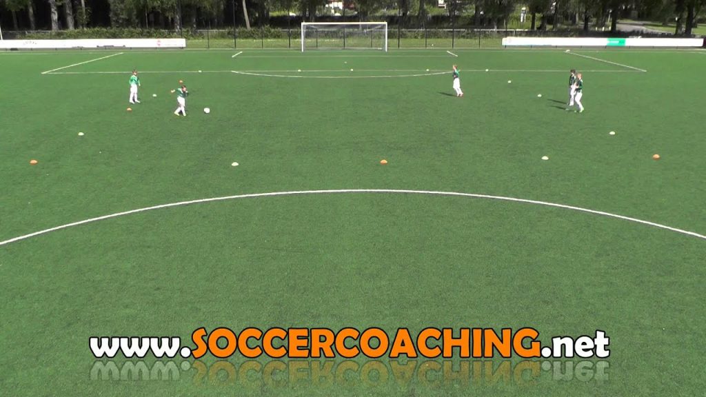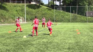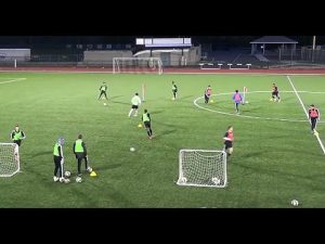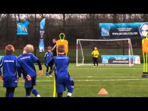 練習の効果 フォワードのファーストタッチで振り向く技術の向上 落としのフェイクからのターン(振り向き)を学べる 練習手順 オフェンスとディフェンスに分かれ、動画のようにゴール正面から左右にずらしてマーカーをセット 二つの…