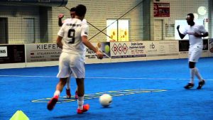 練習の効果 ゴール前でのトラップからの素早いシュート技術向上 限られたコースの中でシュートを狙う(股抜きシュートなど) 練習手順 ペナルティーエリアより少し離れた距離にゴールから右に2つ、左に2つ、真ん中に3つコーンを置…