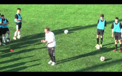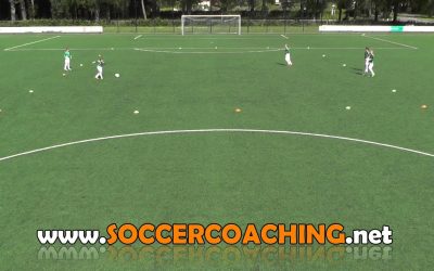 練習の効果 ・受ける前の判断 ・ドリブル 練習手順 動画のように円になるようにマーカーで4人のスタート地点を作り、さらにゴールも4つ置く コーチが選手を指定し指定された選手は攻撃、残り3人がディフェンスとなる ボールが配…