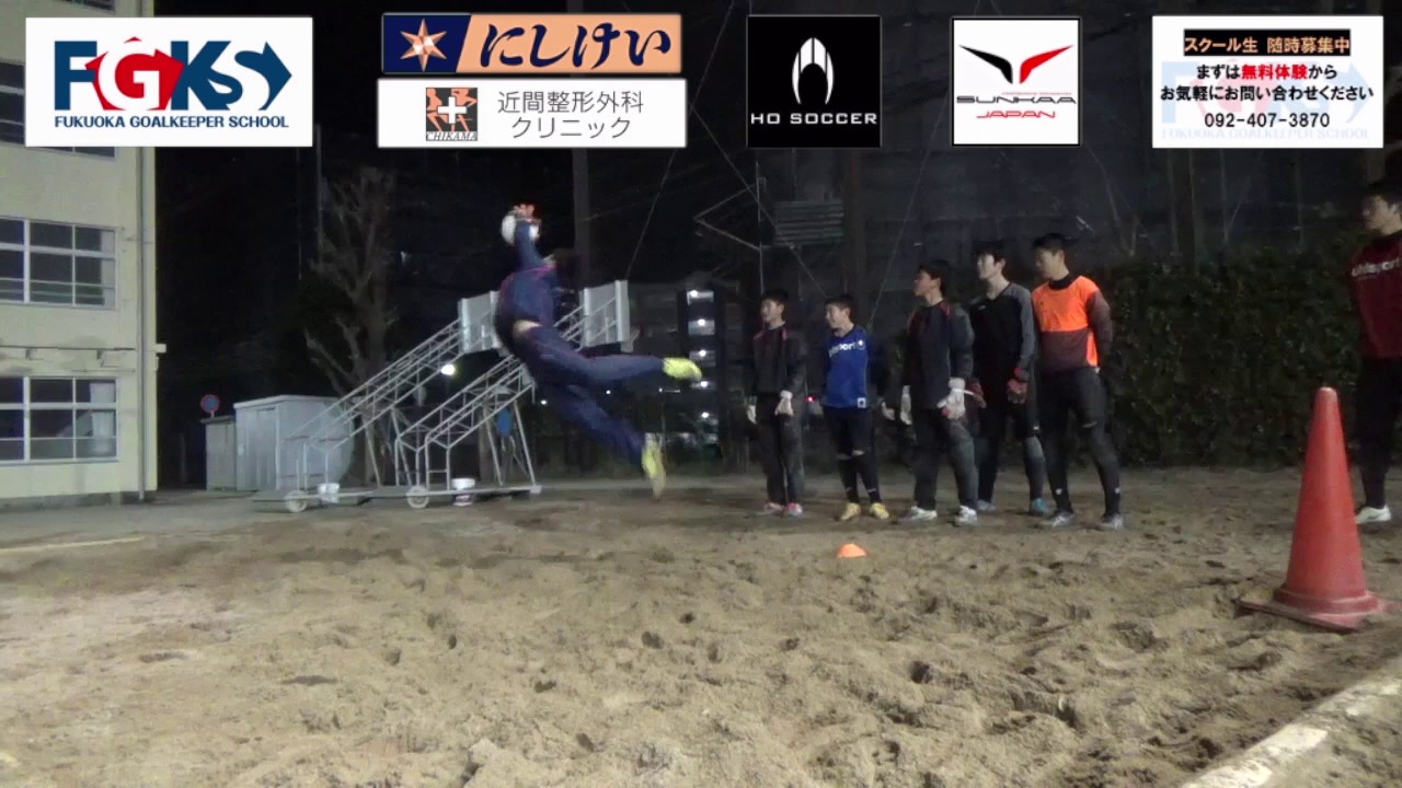 コーンをタッチしてから逆方向に飛んでくるボールを横とびでセービングする