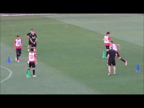 このシュート練習は2列目の選手が走りこんできてフォワードにくさびを当て、落としてもらってミドルシュートというイメージです。