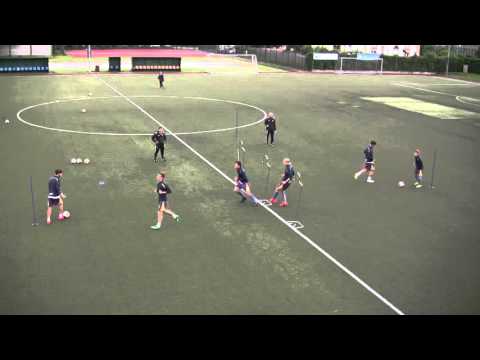 ステップ1では、真ん中のプレーヤーは、コーン(相手DF)の近くで待ち、パスがでる直前にコーン(DF)から素早く離れ、ワンタッチでコーンの間を抜けることが重要です。
