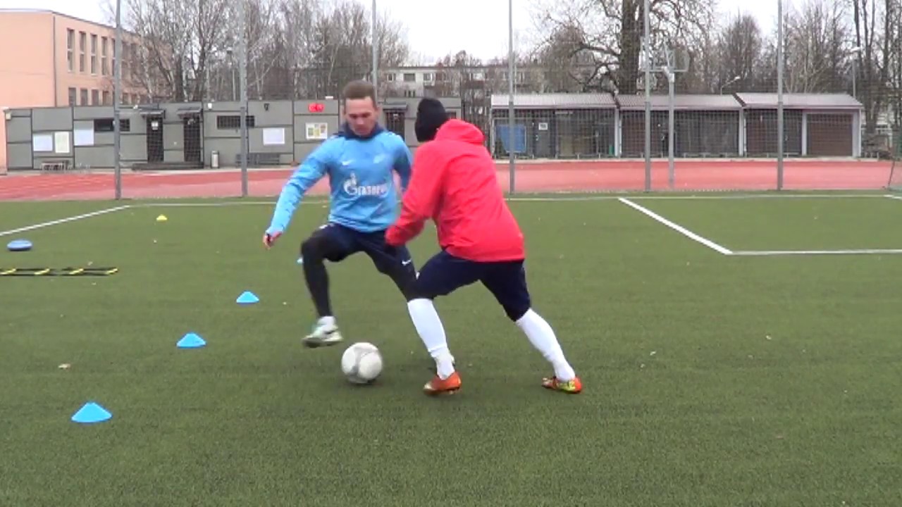 コーチが手前のいずれかに投げたボールを後ろから飛び出してヘディング、終わったら後ろに戻る
