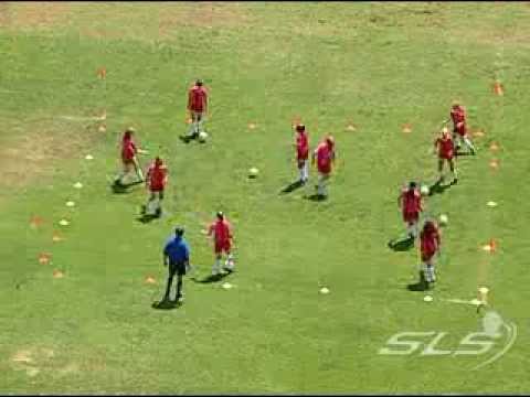 四角形の中にロングパスを出し、一人がトラップ、一人が仲間にパス、最後の一人が相手にロングパスする