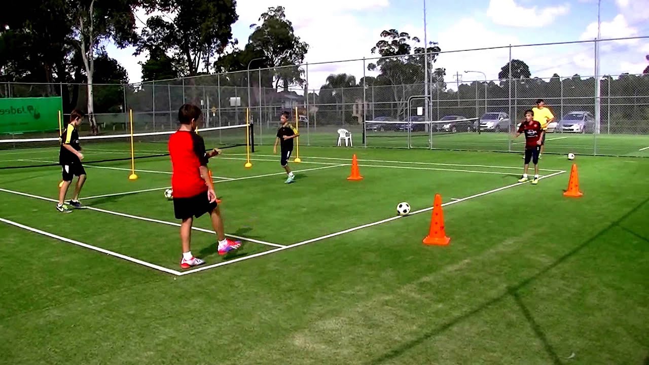 動くパサーはコーンの間で待機して、パス出し役は少しコーンから離れた位置からスタート