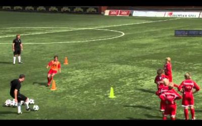 練習の効果 相手の逆を取る動作、ドリブル、トラップが身につきます 練習手順 スタート位置を10mほど離して2つセットする。その中間にマーカーを4つ1m間隔でセットする 中間のマーカーからそれぞれ10mほど離した位置にマー…