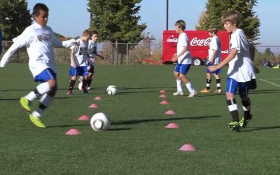 練習の効果 ・シザース ・方向転換 ・ドリブル ・ボールコントロール 練習手順 ミニコーンを等間隔に置き、外側の足でシザースをしながらドリブルをする 慣れてきたら、前方でコーチが示すマーカーの色を当てながら進む 練習のポ…