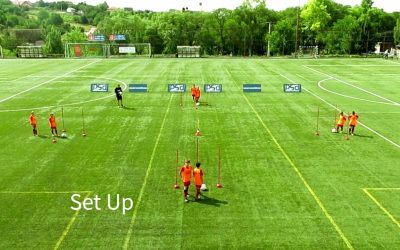 練習の効果 ドリブルスキル、フェイントスキルの向上 練習手順 3個のマーカーで1辺1.5mほどの三角形を作り、その三角形を4つ作成し1辺10mほどの正方形を作る 正方形の中心にマーカーを置く 各三角形に2人セットし1人が…