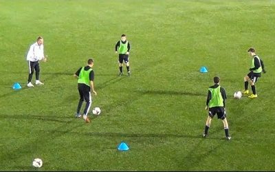 練習の効果 プレースピードを上げることができます。(メニュー1は0:08から。メニュー2は1:18から。) 練習手順 5m×5mのグリッドを作ります。 4人1組を作ります。 メニュー1:ボールが来た方向に返す役割と、来た…