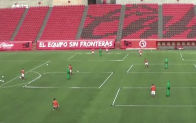 練習の効果 サポート意識した攻撃戦術の向上 パス&ムーブとフリーランの向上 練習手順 ピッチ内ハーフエリアに10m×5mほどのプレーエリアをラインを引いて作成する 配置位置は動画を参考にゴール側から見て、3-…