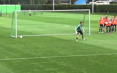 練習の効果 試合中のゴール前での状況に近いシチュエーションでシュート練習を行えます。(メニューは0:30から) 練習手順 ディフェンダー1人はゴールエリア線上から、もう1人はペナルティーアーク外の位置からスタート オフェ…