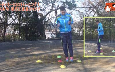 練習の効果 ・コーディネーション ・敏捷性 ・空間認知力 練習手順 4角形にマーカーを置き、四方に連続してジャンプする ボールを投げ上げ、両手を地面にタッチしてボールをキャッチする ボールを上に投げ上げている間にボールを…