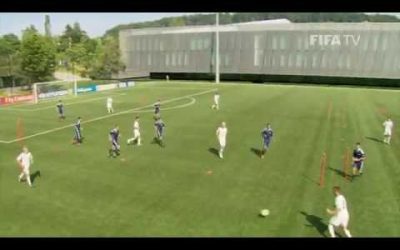 練習の効果 スルーパスの受け方 クロスボールへの入り方 フィニッシュ精度 練習手順 ペナルティエリアよりわずか外にコーンを2つ置き、コーンの前に1人ずつ配置する。またサイドにもクロッサーを一人または目的に合わせた人数を用…