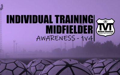 練習の効果 ・受ける前の判断 ・ドリブル 練習手順 動画のように円になるようにマーカーで4人のスタート地点を作り、さらにゴールも4つ置く コーチが選手を指定し指定された選手は攻撃、残り3人がディフェンスとなる ボールが配…